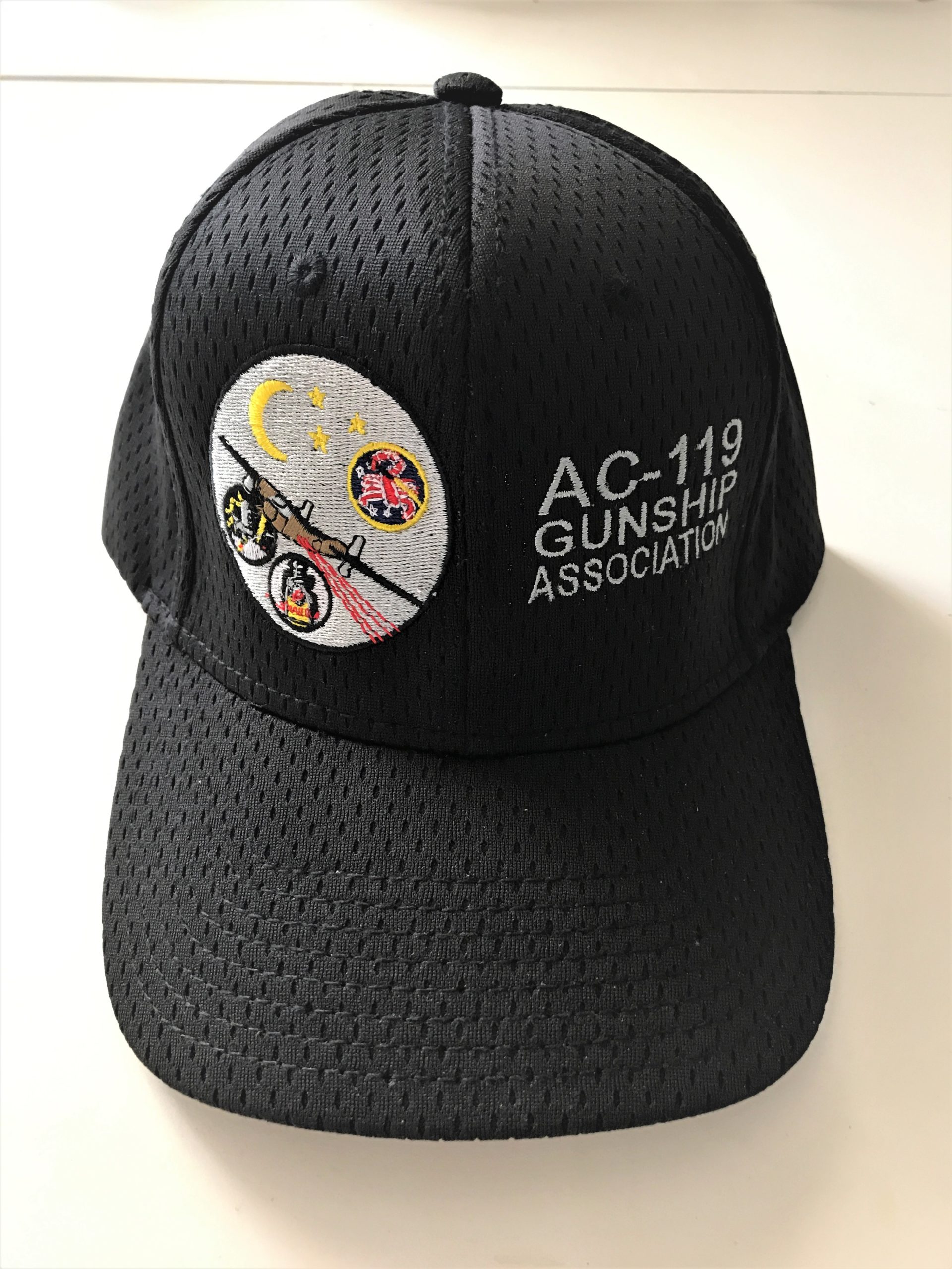 AC-119 Gunship Association black mesh material, baseball-style hat with adjustable back strap. Good for summer. AC-119 Gunship Association patch and lettering.