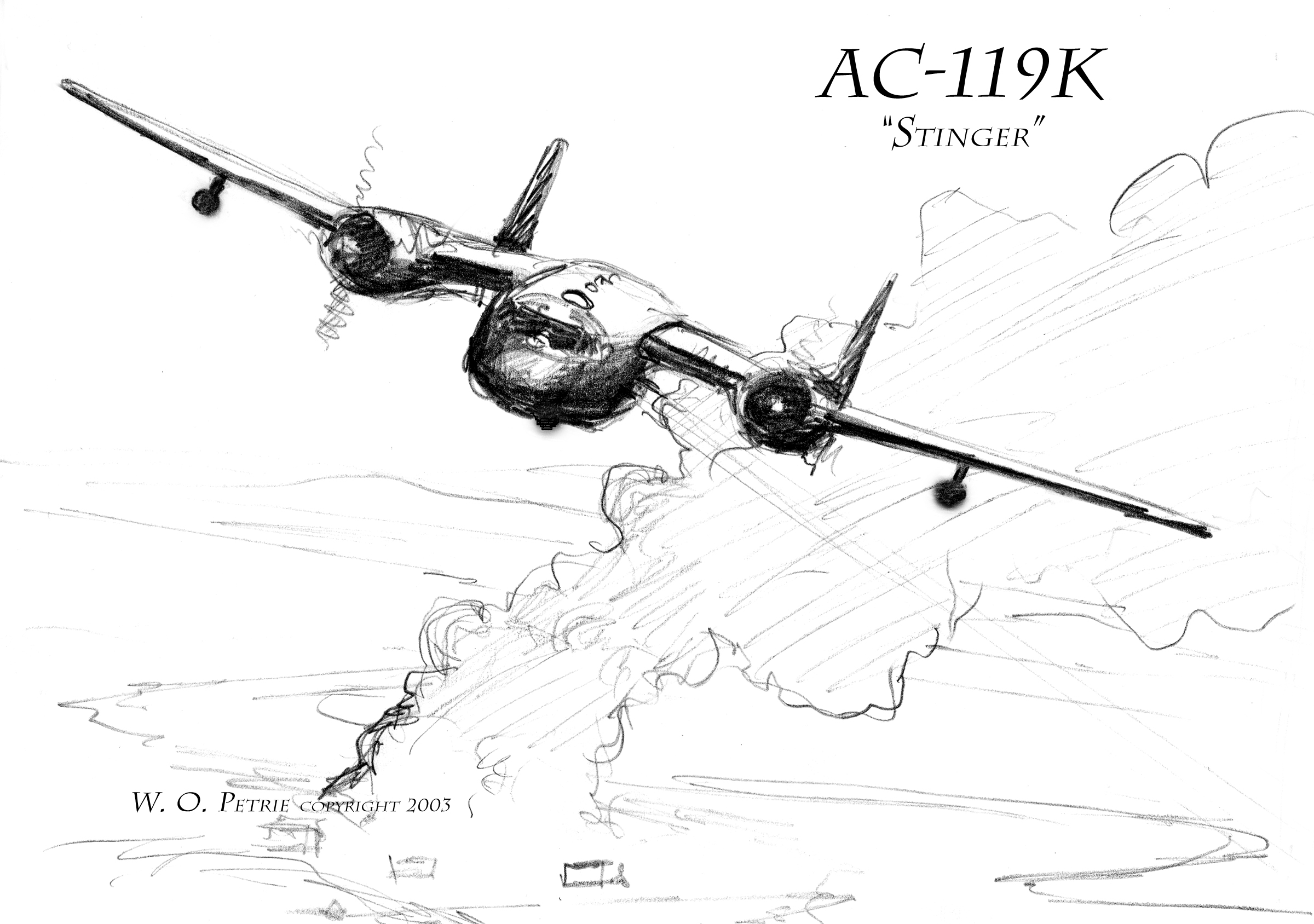 This print was hand drawn with pen and ink by Bill Petrie. It is a black and white 8″ x 10″ drawing of the AC-119K in flight. Taken from the “Brothers” print.